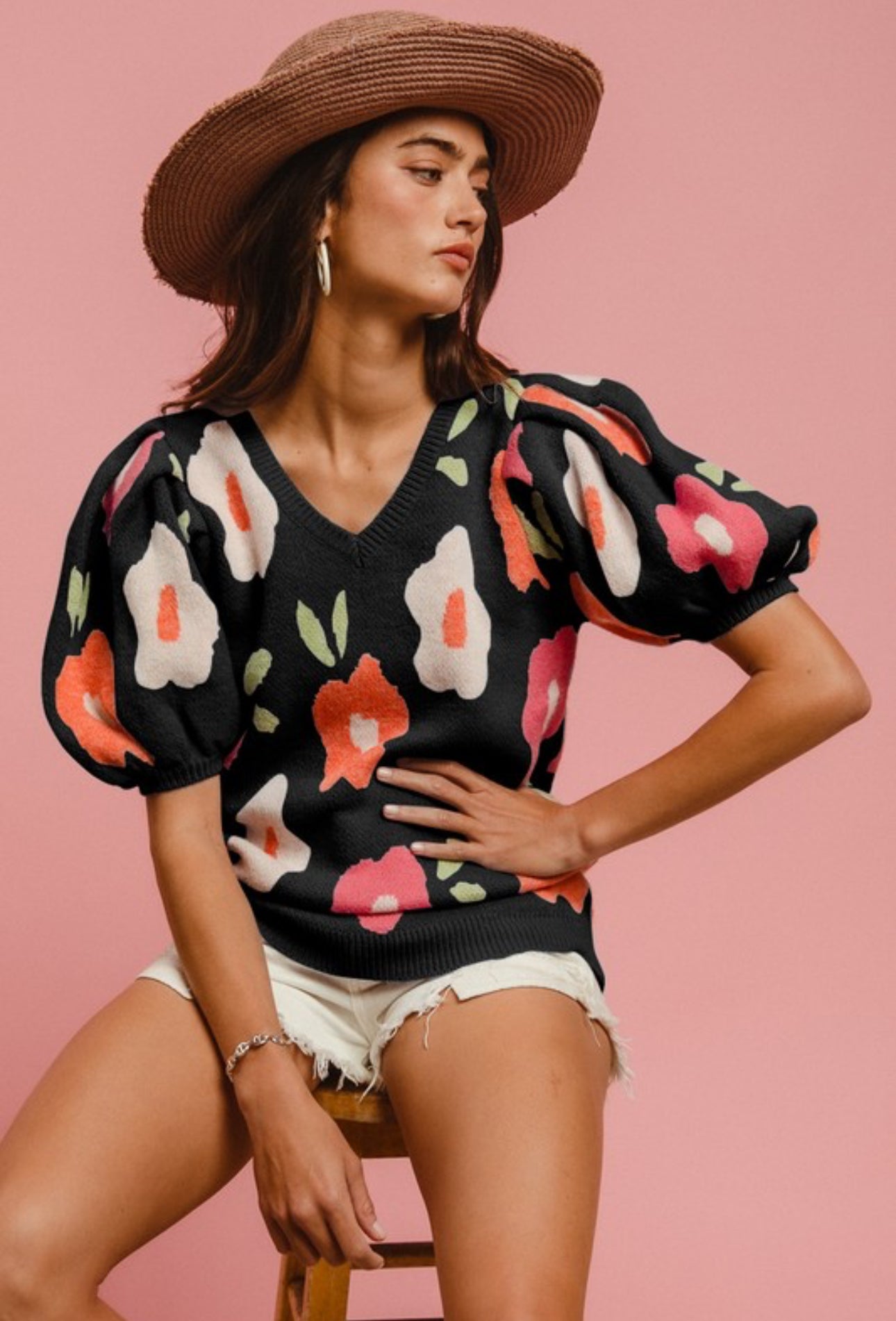 Floral Pattern Puff Sleeve V-Neck Sweater