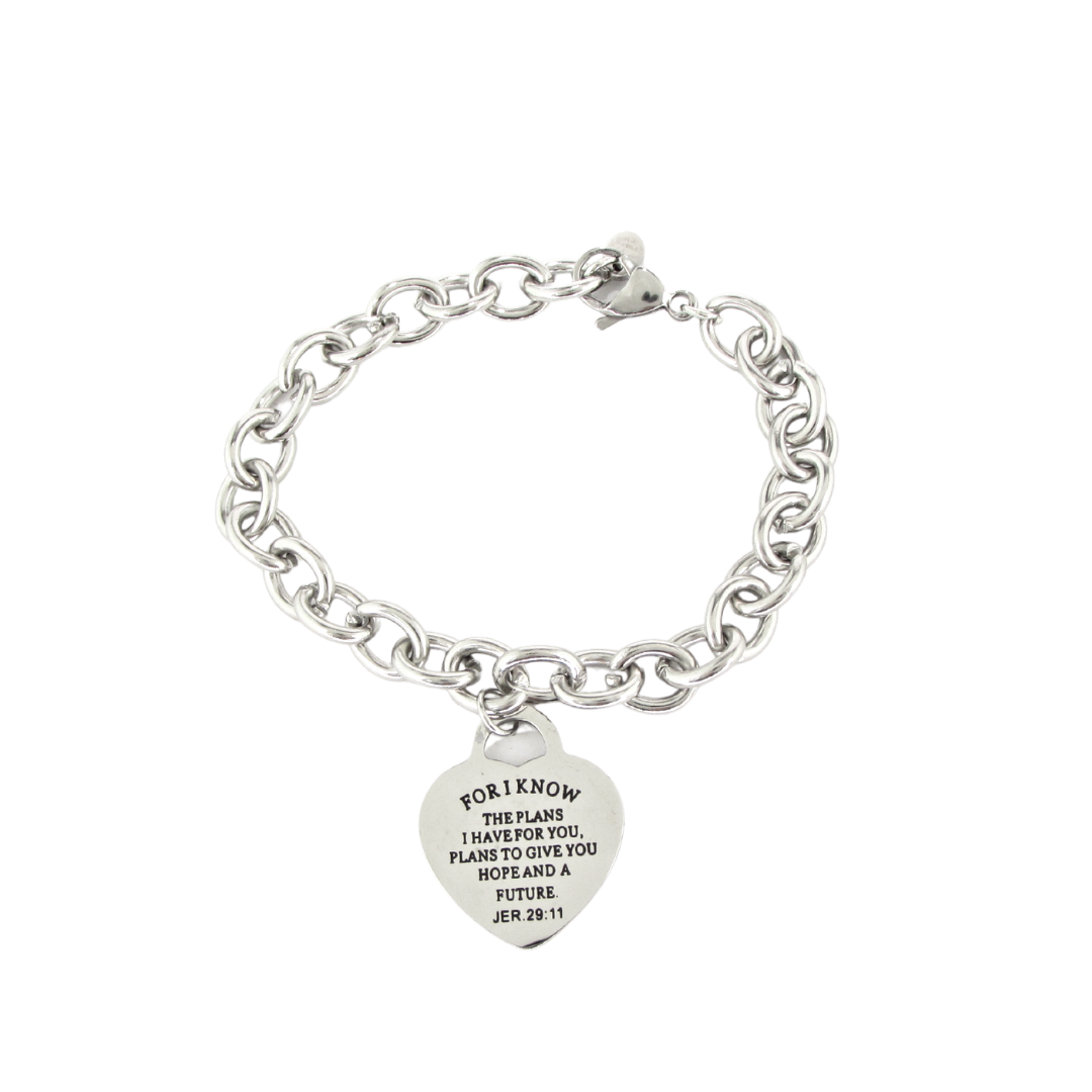 Our beautiful Destiny Heart Bracelet made with Stainless Steel will help remind you that God loves you greatly with double sided engraved Bible Verses from Jeremiah 29:11 and Philippians 4:13.
