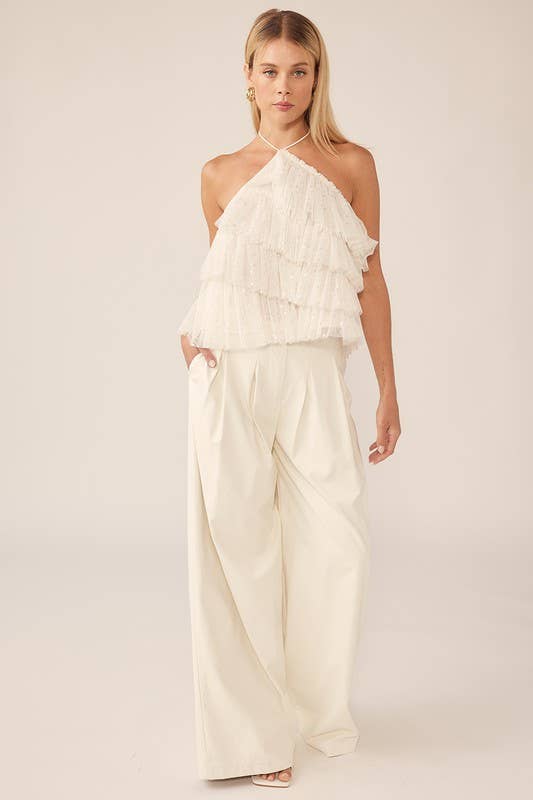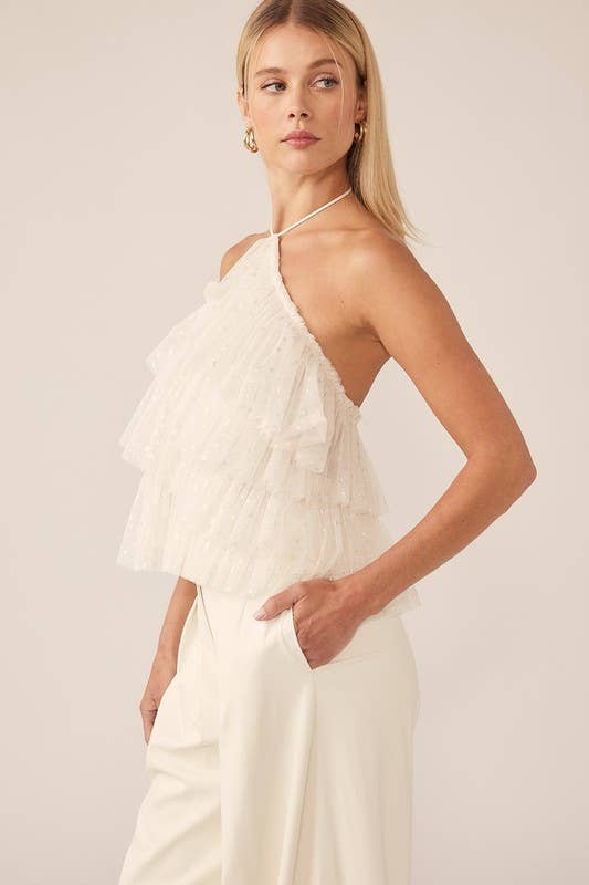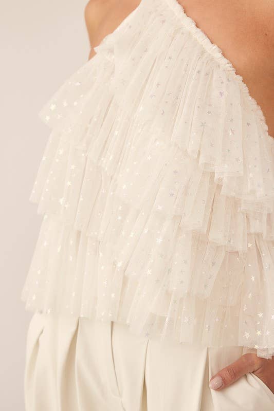 This tulle diagonally tiered halter neck top with an iridescent foil star pattern has adjustable spaghetti straps.