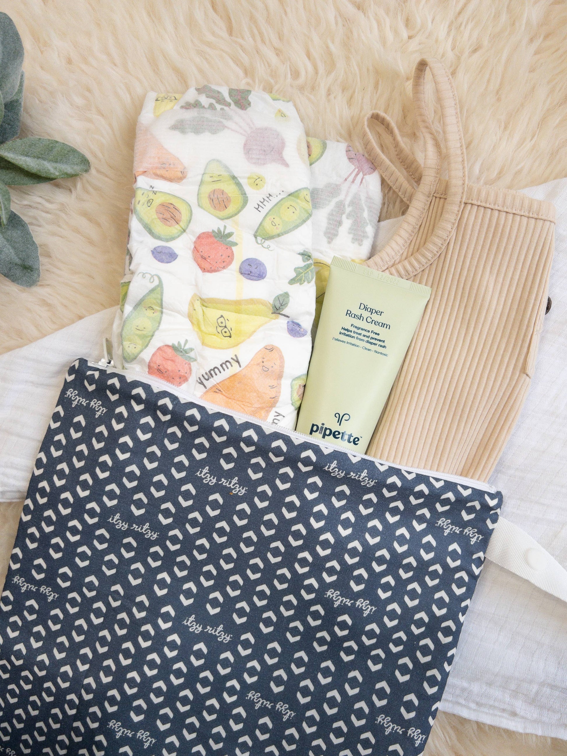 Perfect for separating wet items and keeping them dry. Adjustable snap, nylon handle perfect for attaching to bags, strollers and more. Lead free YKK zipper top keeps odors and contents securely inside. BPA free, PVC-free, lead-free, CPSIA compliant. Thick and soft polyurethane laminate waterproof lining interior. Measures 11" x 14"