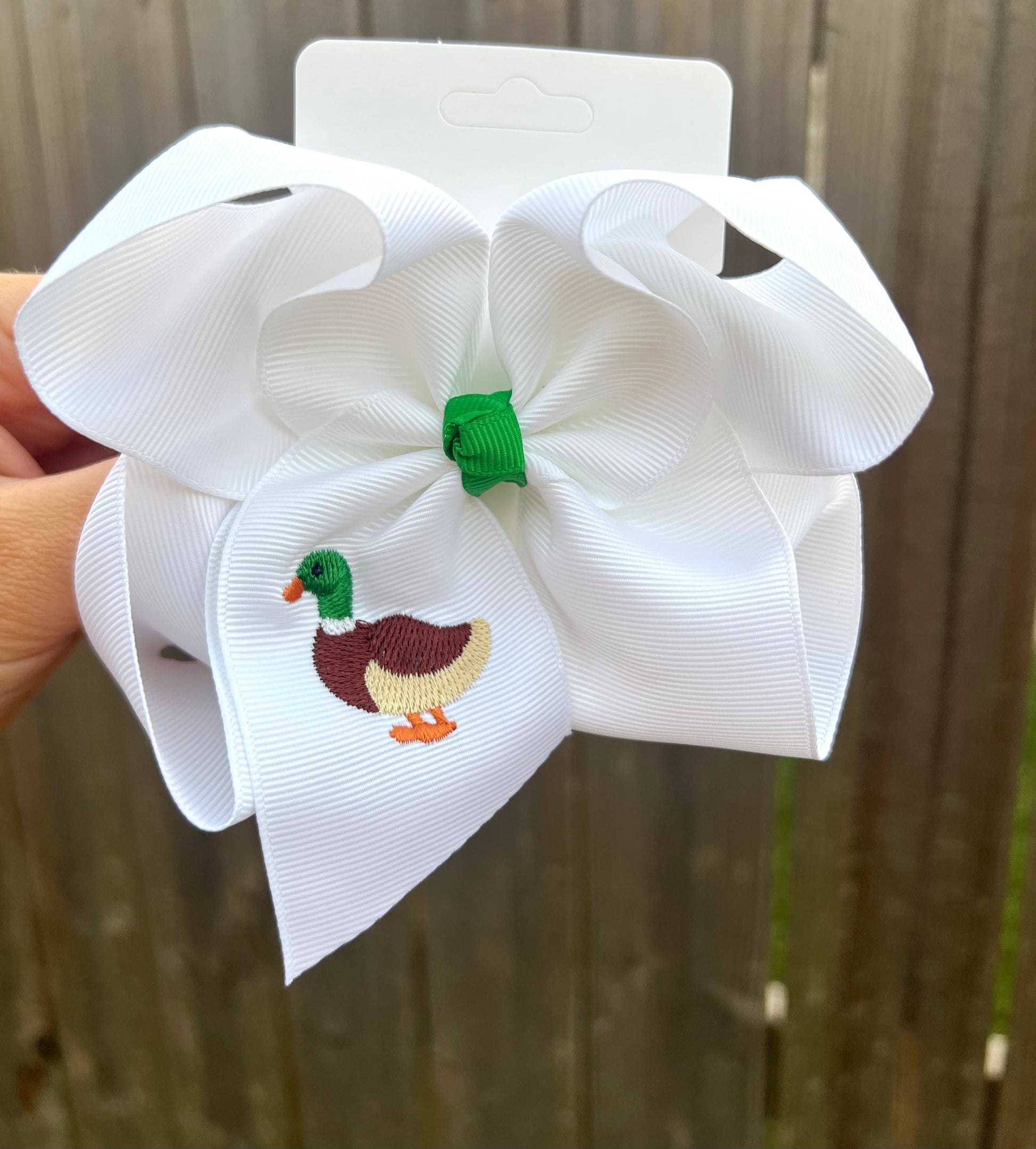 Quack-tastic and Daddy approved, our 5-inch Mallard Duck Embroidered Hair Bow is the perfect accessory to complete any mallard-themed outfit! With its charming embroidered design, this playful bow adds a touch of whimsy and style to your little one's look. Whether for a day out in nature or a special occasion, this bow is sure to turn heads and make a splash!