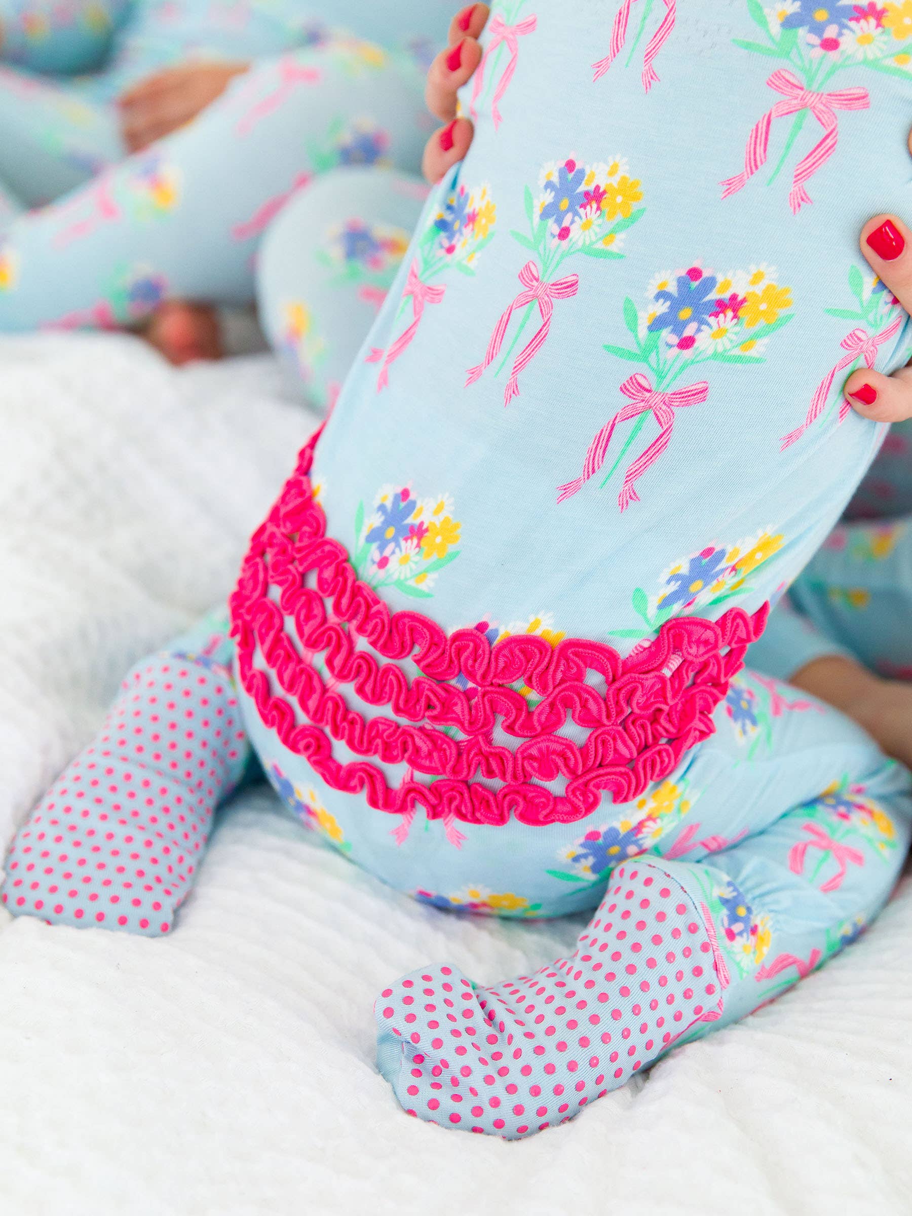 RuffleButts + RuggedButts - Baby Girls Bows and Bouquets Bamboo Viscose Footed Ruffle One Piece Pajama