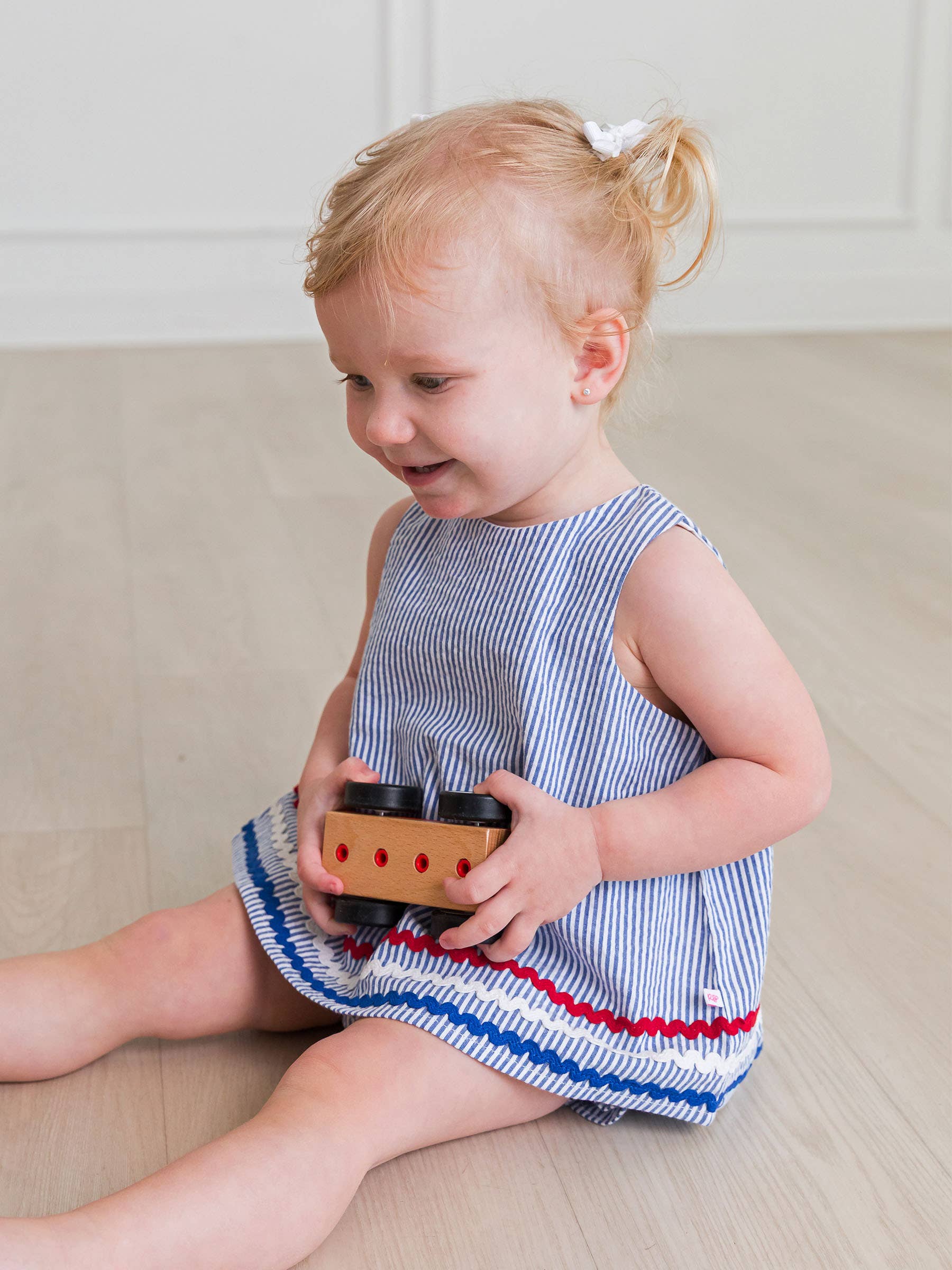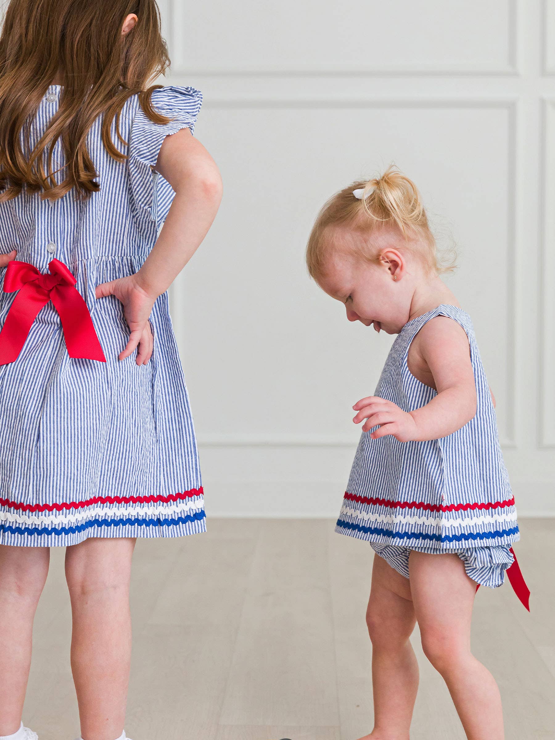 RuffleButts + RuggedButts - Baby Girls Classic Blue Americana Seersucker Ric Rac Swing Top & Bloomer Set