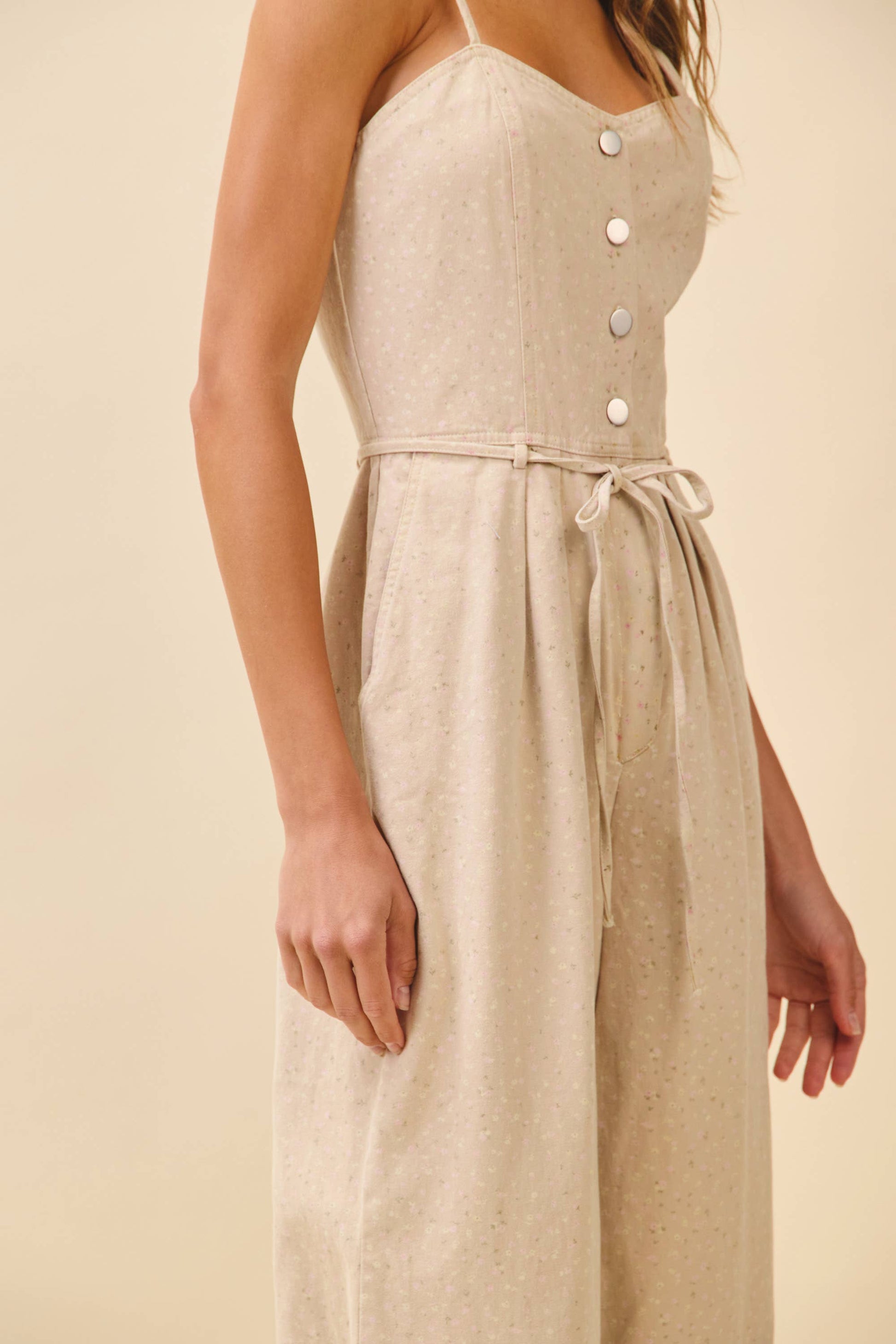 Micro floral print wide-leg jumpsuit featuring a sweetheart neckline with button-front detail, adjustable spaghetti straps, and a drawstring waist. Complete with side pockets and a relaxed fit.